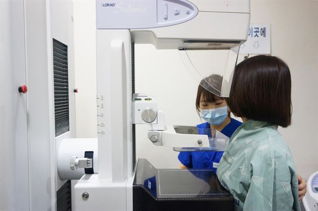 유방암 의심 환자가 유방암 여부를 확인하기 위해 유방촬영을 하고 있다. 한국일보 자료사진