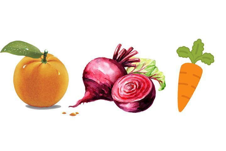 오렌지 한 개, 비트 110-130g, 당근 60-80g. 먹기 힘들다면 오렌지를 더 넣거나 꿀을 섞어보자.