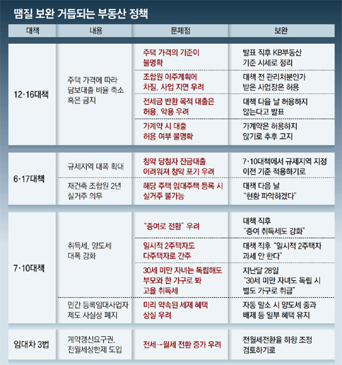 [부동산대책 논란]임대주택 과세, 땜질 이틀만에 또 혼란 부부 공동소유에 개인기준 과세… 양도세 특례 ‘사각지대’ 자초 12·16대책, 주택가격 기준 놓고 혼선… 7·10땐 ‘일시적 2주택’ 취득세 번복