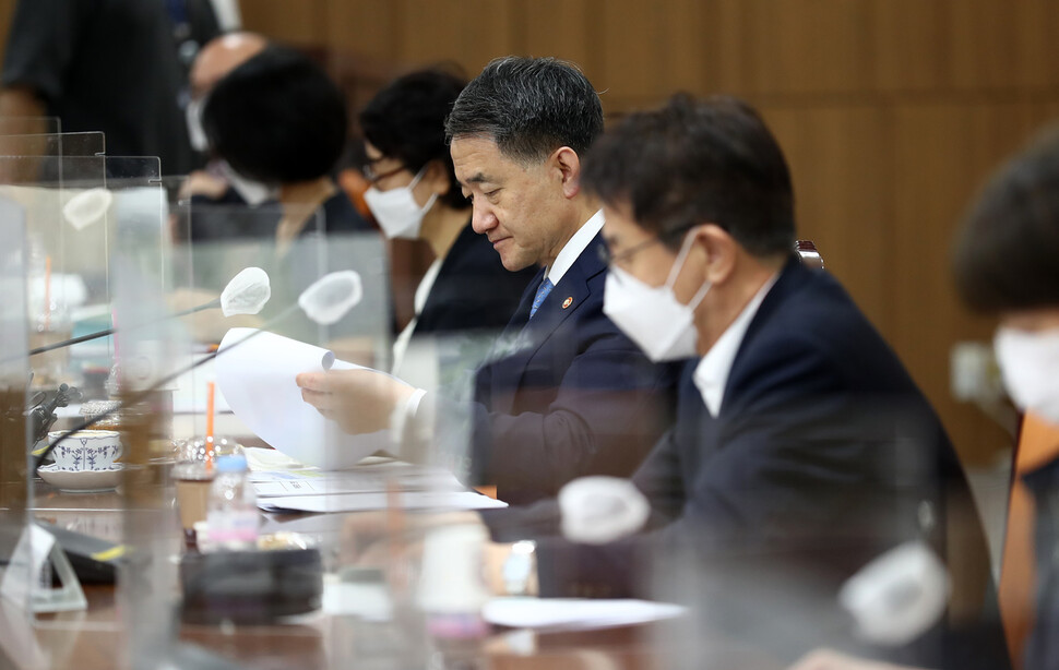 박능후 보건복지부 장관이 10일 오후 세종시 어진동 정부세종청사 보건복지부 대회의실에서 열린 제61차 중앙생활보장위원회에서 자료를 확인하고 있다. 연합뉴스
