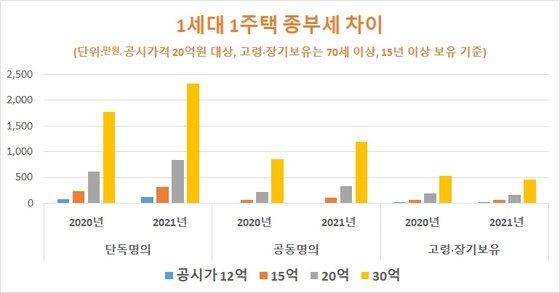 올해와 내년 공시가격이 30억원으로 같을 경우 공동명의 종부세가 올해 851만원에서 내년 1197만원으로 40% 오른다. 반면 단독 명의이면서 고령·장기 보유 공제를 받으면 종부세가 530만원에서 463만원으로 13% 줄어든다.