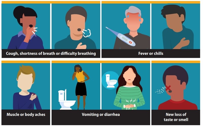미국 질병통제예방센터의 코로나19 증상 포스터. 왼쪽 위부터 시계 방향으로 기침,호흡곤란, 발열 또는 오한, 미각 및 후각 상실, 구토 또는 설사, 근육통.