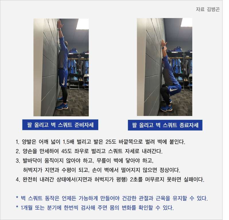 스쿼트 동작은 단순하게 저항운동을 하는 종목이 아니다. 올바른 스쿼트 동작이 만들어진다는 것은 내 몸의 관절, 근육, 움직임 등이 원활하다는 것을 의미한다. 따라서 올바른 스쿼트 동작을 한다는 건 나이가 들거나 부상에 따라 변화하는 몸을 지속해 유지하고 관리할 수 있는 지표가 될 수 있다. 아래의 스쿼트 테스트를 집에서 가족과 함께 해보자. 내 몸의 문제를 아는 것이 건강을 지키는 첫 번째다.