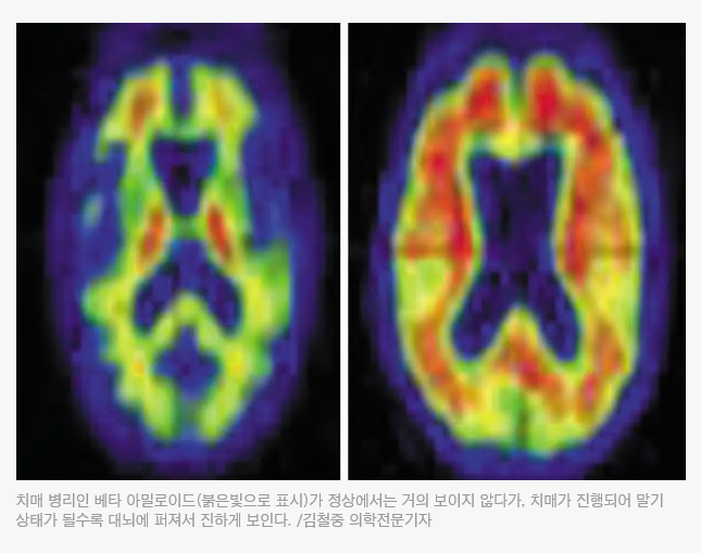 치매 병리는 대뇌에 베타 아밀로이드라는 변형 단백질이 침착하는 것이다. 이는 머리를 쓰면 자연스럽게 생겨나는 대사물질이지만, 정상적으로 제거돼야 한다. 제거가 안 되고 뇌에 쌓이고 뭉치면 뇌세포가 손상된다. 그러다가 뇌에 넓은 범위로 늘어나면 치매 진행이 가속화 된다. 모두 일치하는 것은 아니지만, 치매 단계가 진행될수록 아밀로이드 침착은 늘어난다.