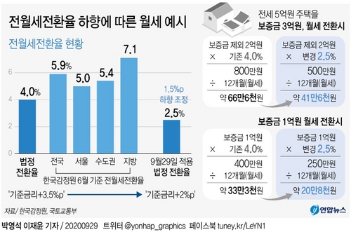 전세 보증금 1억원을 월세로 돌린다고 하면 이전에는 1억원X4.0%/12, 즉 33만3천원의 월세가 계산됐지만 이제는 1억원X2.5%/12, 20만8천여원이 된다.