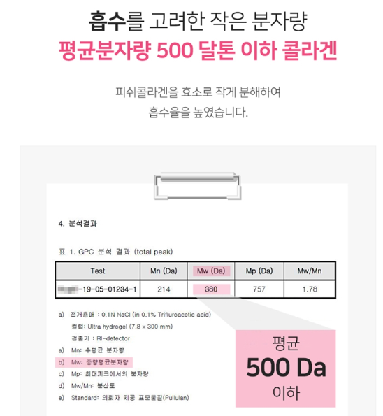 앞서도 언급했듯이 콜라겐의 흡수율을 높이기 위해서는 분자량을 확인해야 합니다.