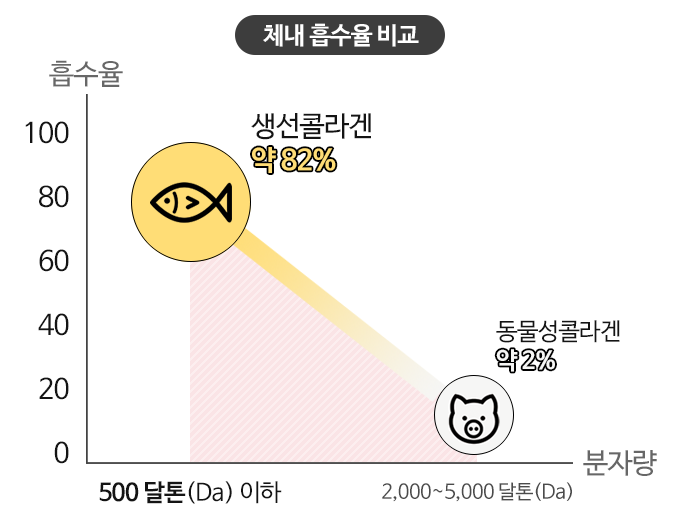 실제 체내 흡수율을 비교한 임상논문 자료를 보면 동물성 콜라겐에 비해 분자량이 작은 생선 콜라겐의 흡수율이 무려 42배나 더 높은 것을 확인할 수 있습니다.