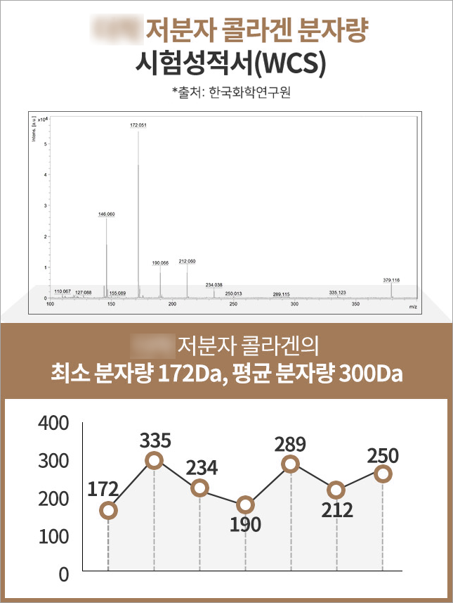 분자량을 보고 콜라겐 고르실 땐 달톤 수치가 객관적으로 검증된 시험성적서가 있는지 확인해야 하고 수치를 정확히 측정했다는 의미의 WCS 표기도 필수로 보셔야 합니다.