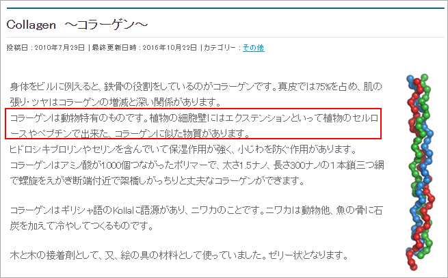 (コラーゲン動物特有のものです。植物細胞胞壁はエクステンションといって植物のセルロ ースやペプチンで出来た。コラーゲンに似た物質があります。)