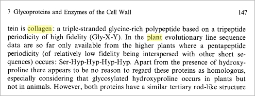 식물의 세포벽 사이를 지지해주는 구조 단백질은 식물의 약 1%를 차지하며 하이드록시프롤린단백질(HRGP), 글리신단백질(GRP), 프롤린단백질(PRP) 등의 당단백질로 나눠진다고 되어 있습니다. 즉, 식물의 하이드록시프롤린 성분은 매우 극소량이라는 의미입니다.