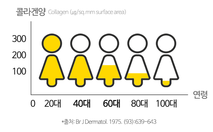 체내 콜라겐 함량은 20대부터 줄어들기 시작해 노화가 진행될수록 빠른 속도로 감소하는데, 여성의 경우 20대 중반부터 1년에 1%씩 감소하여 40대가 되면 20대의 절반 수준이 되고 이후부터는 콜라겐 합성이 급격히 감소하게 됩니다. 체내에서 자체적으로 합성할 수 있는 콜라겐의 양이 20대부터 줄어들기 때문에 노화가 시작되는 20대부터 콜라겐을 미리 보충해주는 것이 매우 중요합니다.