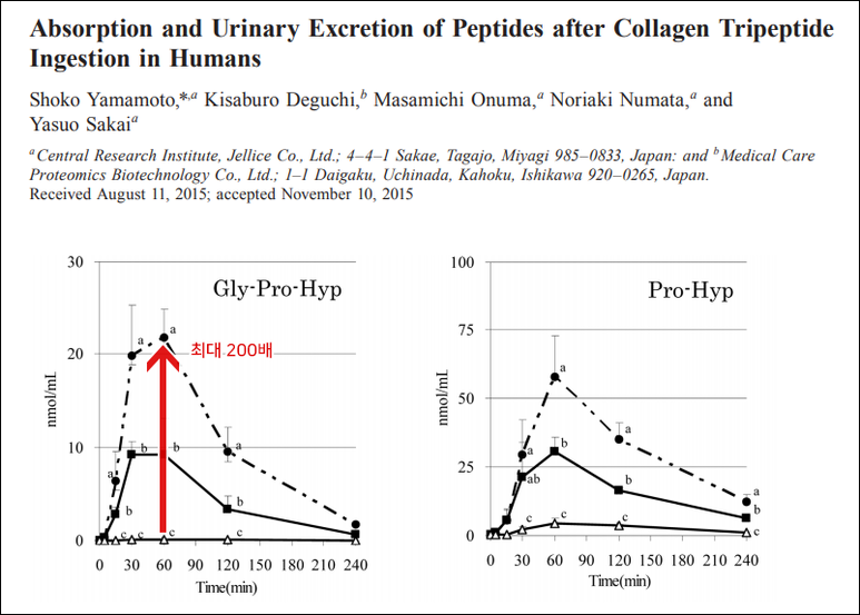 1. Absorption and Urinary Excretion of Peptides after Collagen Tripeptide Ingestion in Humans. 2016, 생물학 및 제약회보- 인체의 콜라겐트리펩타이드 섭취 후 펩타이드의 흡수 및 배출