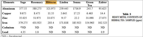 한 논문의 실험결과를 보면 히비스커스에서 알루미늄이 321.9ppm, 구리는 11.5ppm 검출되었으며