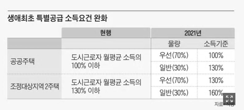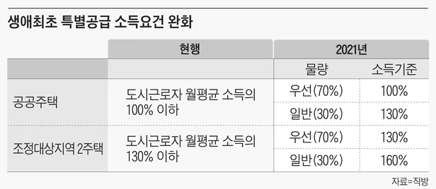 생애최초 특별공급 소득기준도 완화된다. 현재 공공주택의 생애최초 특별공급 소득기준은 도시근로자 월평균 소득의 100% 이하, 민영주택의 생애최초 특별공급 소득기준은 도시근로자 월평균 소득의 130% 이하지만 2021년부터는 공공주택은 130% 이하까지, 민영주택은 160% 이하까지 완화된다.