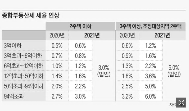 2021년 1월부터 종합부동산세 세율이 인상된다. 2주택 이하 보유자의 경우 과세표준 구간별로 0.1~0.3%p가량 인상되며, 3주택 이상 및 조정대상지역 2주택자는 과세표준 구간별로 0.6~2.8%p 인상될 예정이다. 기숙사 등을 제외한 법인 보유주택에 대해서는 개인 최고세율을 적용해 2주택 이하는 3%, 3주택 이상은 6%가 일괄 적용된다. 과세표준을 정할 때 주택공시가격에 적용하는 공정시장가액 적용비율도 2020년 90%에서 2021년 95%로 인상된다.