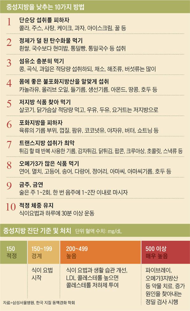 최성희 교수는 “금주·금연하고, 하루 30분 이상 유산소 운동을 해야 한다”며 “중성지방 수치가 200~499인 상태에서는 생활 식이 요법을 먼저 시행하고 그랬음에도 중성지방 수치가 높게 유지되거나 LDL 콜레스테롤 수치도 높다면 약물 치료를 받는 게 권장된다”고 말했다.