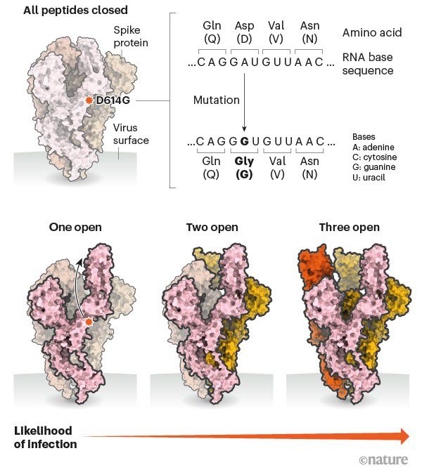 코로나 바이러스 돌연변이 D614G의 스파이크 단백질 구조. 바이러스는 이 단백질로 숙주세포에 결합한다. 유전자 염기 하나가 달라지면서 스파이크 단백질을 구성하는 아미노산 하나가 D에서 G로 바뀐다(위). 그 결과 스파이크의 구조가 열린 형태가 되고 감염력이 높아진다(아래)./네이처