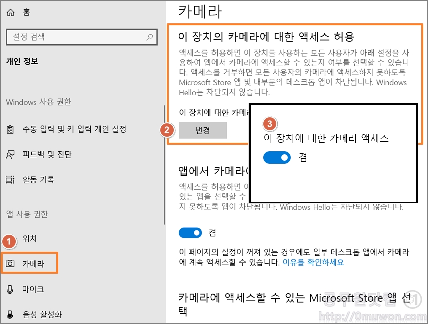 ▼ 개인정보 > 카메라를 선택합니다. 이 장치의 카메라에 대한 엑세스 허용에서 변경 버튼을 클릭하여 이 장치에 대한 카메라 액서스를 키면 됩니다. 설정은 이것이 전부입니다. 평소 사용하지 않아서 그렇지 설정 방법은 매우 간단합니다.