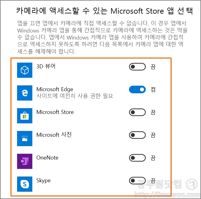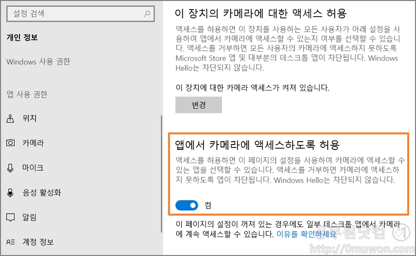 ▼ 개별 앱에서만 카메라를 작동하게만도 할 수 있습니다. 앱에서 카메라에 액서스하도록 허용 메뉴를 키세요.