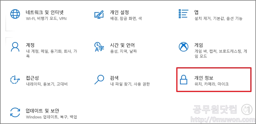 ▼ 윈도우 시작버튼을 클릭 후 설정 > 개인 정보를 클릭합니다.