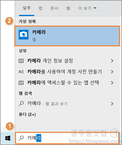 ▼ 윈도우 검색에서 카메라를 입력합니다. 그리면 상단에 카메라 앱이 나타납니다. 이걸 클릭하세요.
