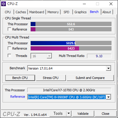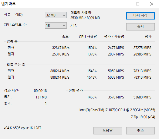 압축프로그램 7-Zip 내부에 포함된 CPU 벤치마크. 53,609MIPS로 측정됐다. 참고로 수랭 쿨러를 장착하고 메모리를 16GB로 늘린 코어 i9-9900가 63,784MIPS로 측정된다.