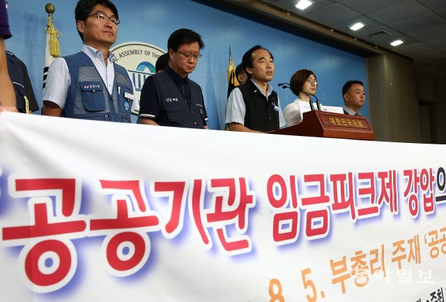 정년연장과 임금피크제 도입 직전인 2015년 국회 기자회견장에서 임금피크제 반대 의견을 밝히는 양대노총 관계자들. 동아일보DB