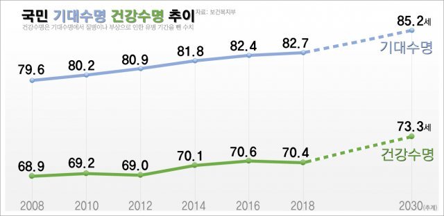 통계청이 지난해 말 발표한 2019년 생명표를 보면 2019년 출생아의 기대수명은 83.3년이다. 집계가 시작된 1970년 62.3세에서 20년 이상 늘었다. 이제는 각자 대략 90세까지는 산다고 생각하고 미래를 준비하지 않으면 안될 상황이다. 다만 유의해야 할 점은 건강수명이 따로 있다는 점이다. 건강수명은 질병치레 없이 건강하고 활기차게 움직일 수 있는 기간을 말한다. 보건복지부가 지난달 27일 발표한 ‘제5차 국민건강증진종합계획’에 따르면 한국인의 건강수명은 2018년 기준 70.4세다.