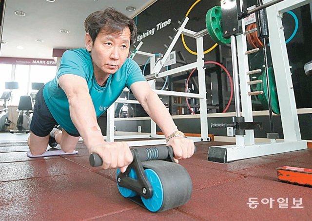 김광준 중앙대병원 산부인과 교수는 16년째 같은 헬스클럽에서 격일로 유산소 운동과 근력 운동을 꾸준히 이어가고 있다. 김 교수가 휠슬라이드라는 도구를 이용해 코어 근육을 강화하는 운동을 하고 있다.
