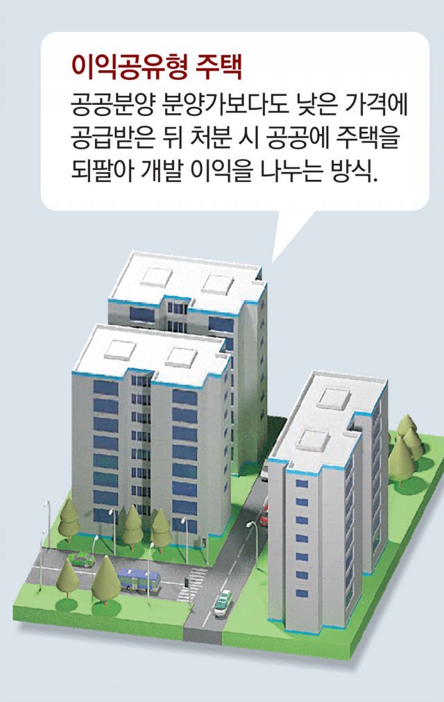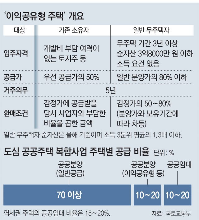 개정안에 따르면 도심 복합사업으로 지어지는 주택의 10∼20%는 공공자가주택(개인에게 분양하되 소유나 처분을 제한하는 방식)으로 공급된다. 이익공유형 주택은 지분적립형 주택(주택 지분의 일부만 먼저 사들인 뒤 나머지는 20, 30년에 걸쳐 취득)과 함께 대표적인 공공자가주택으로 꼽힌다