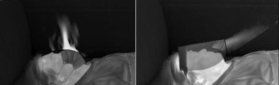 | ↑ 적외선 카메라로 (왼쪽)비말 마스크 착용과 (오른쪽) 쉴드 마스크 착용 시의 호흡 상태를 촬영한 모습. / 사진=아주대병원 |