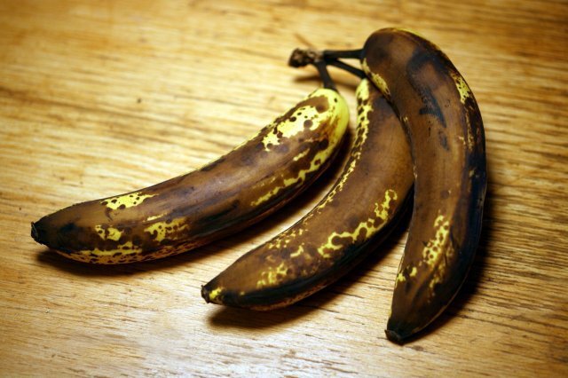 갈색 바나나 바나나는 수확 후 ‘에틸렌(Ethylene)’이 많이 나오는 과일로 꼽힌다. 에틸렌은 과일이나 채소가 익으면서 자연스럽게 생성되는 식물호르몬으로, 식물의 숙성과 노화를 촉진한다. 바나나는 꼭지 부분에서 에틸렌이 분비되는데, 이곳을 막아두면 갈변을 어느 정도 늦출 수 있다. 완전히 후숙된 갈색 바나나는 설탕 대신 사용해도 될 정도로 단맛이 강하지만 영양적 이점을 잃게 된다. 발효가 시작된 바나나는 알코올 냄새가 날 수 있으며 바나나 한 개 당 최대 0.5g의 알코올을 함유할 수 있다.