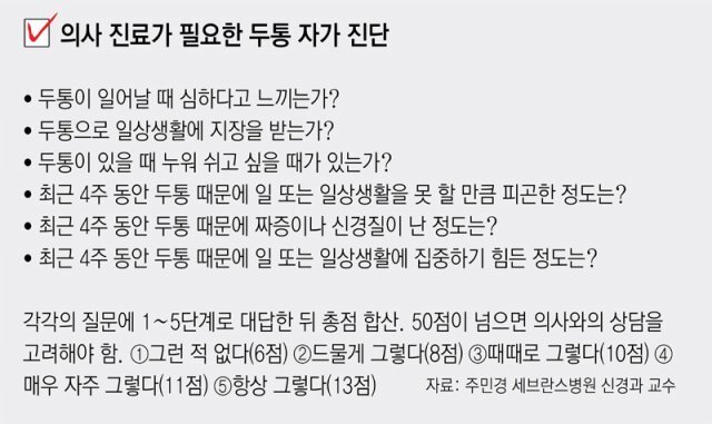 주 교수에 따르면 병원을 찾은 두통 환자의 90% 이상은 일차 두통에 해당한다. 일차 두통 중에서는 전체 인구의 30∼50%에서 나타나는 긴장형 두통이 가장 흔하다. 조이는 듯한 통증, 머리가 묵직한 느낌이 주로 나타나는 증세다. 뒷목까지 뻐근할 수도 있다. 피로, 스트레스, 잘못된 자세가 원인으로 여겨진다.