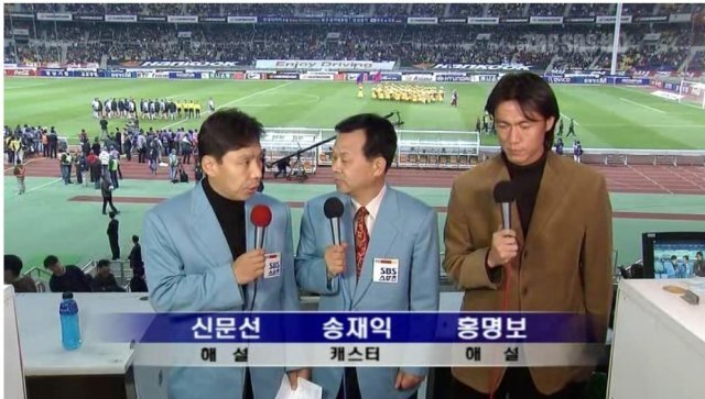 송재익 캐스터가 신문선, 홍명보 해설위원과 축구 중계를 하고 있는 장면. SBS 캡쳐