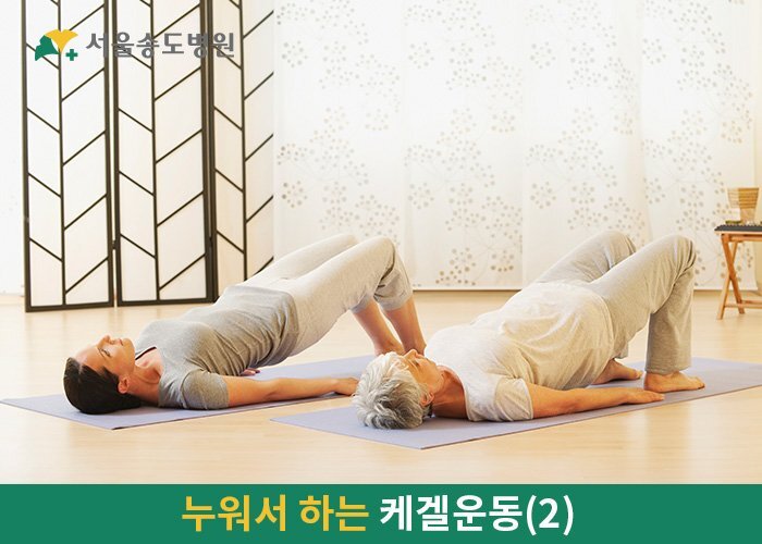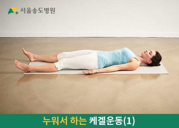 천장을 본 상태로 누워 다리를 어깨 넓이보다 조금 더 넓게 벌려줍니다. 이 상태에서 몸에 힘을 뺀 뒤 골반근육을 약 5초 동안 수축시킵니다. 골반근육을 수축할 땐 위로 쑥 당긴다는 느낌으로 항문과 요도, 질을 오므리는 것이 좋습니다. 이 상태로 5~10초 정도 유지한 뒤 서서히 힘을 뺍니다.