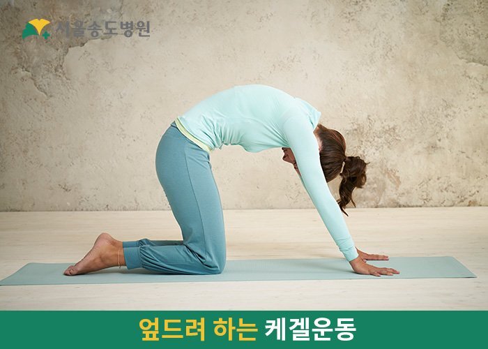 무릎을 꿇은 뒤 손으로 바닥을 짚어줍니다. 이후 숨을 들이마시면서 등을 동그랗게 마는 동시에 항문과 요도, 질을 조여줍니다. 동그랗게 말았던 몸을 펴주면서 천천히 호흡을 내쉽니다. 요가에서도 쉽게 볼 수 있는 동작으로, 마찬가지로 5~10초 동안 수축하고 이완하기를 10회 반복합니다.
