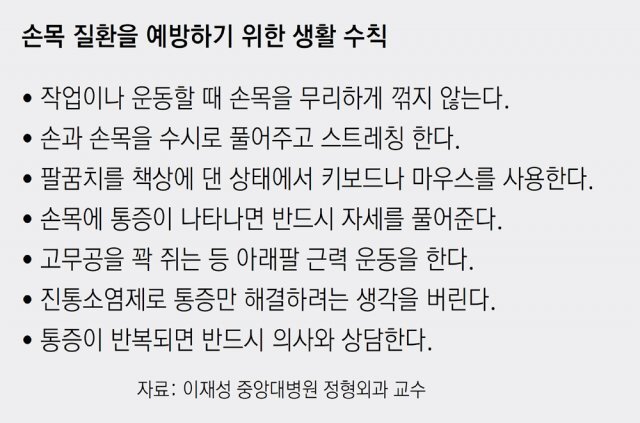 다만 소염진통제를 남용하는 것은 옳지 않다. 이 교수에 따르면 의외로 많은 사람이 손목이 삐었다고 생각하며 소염진통제만 먹는다. 통증만 잠재우는 식인데, 근본 원인은 그대로 뒀으니 질병이 악화될 가능성이 있다. 원래 상태를 회복하지 못할 정도로 관절이 망가지거나 손목을 제대로 움직이지 못하는 지경에 이르기도 한다. A 씨가 대표적 사례다.