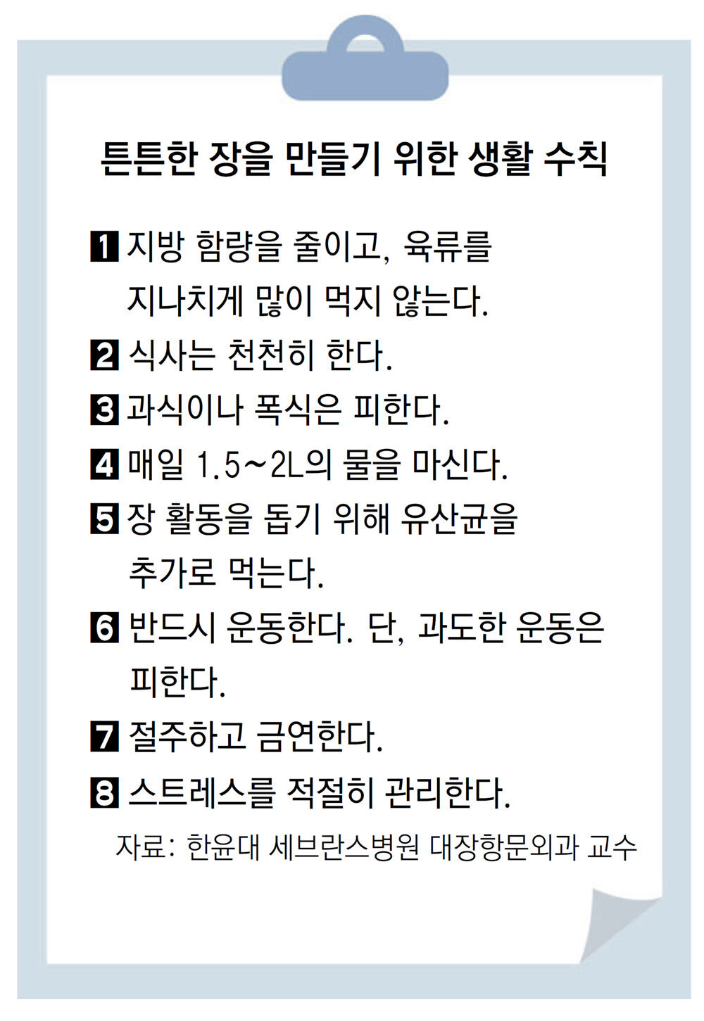 한 교수는 튼튼한 장을 만들려면 이 밖에도 △지방을 줄이고 영양 균형이 잡힌 식사를 하고 △반드시 운동하되 과하지 않도록 하며 △절주하고 금연하며 △스트레스를 관리하는 등의 노력이 필요하다고 덧붙였다