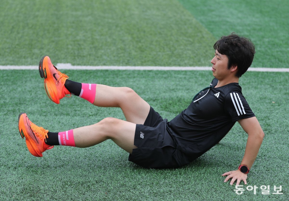 크게보기서현민 교수가 운동장에 앉은 채로 양쪽 다리를 번갈아 올리는 스트레칭을 하고 있다. 안철민 기자 acm08@donga.com