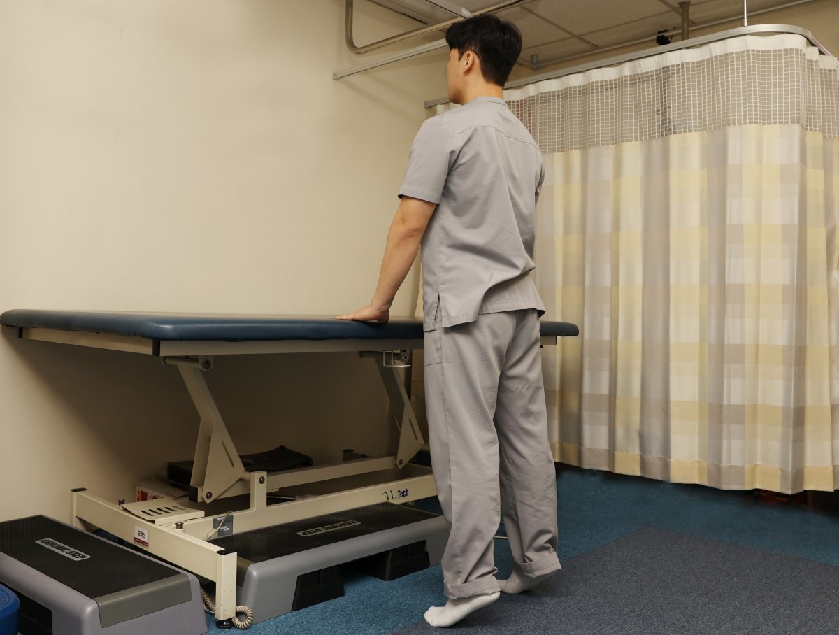 ① 손으로 책상을 짚은 상태에서 뒷발을 들어 까치발 자세를 한다. 이때 배를 살짝 내밀면서 상체를 뒤로 젖히는 느낌이 들도록 한다. 또 엉덩이에 의도적으로 힘을 준다. 이 자세를 3초 유지한다. 틈날 때마다 이 동작을 하는 게 좋다.