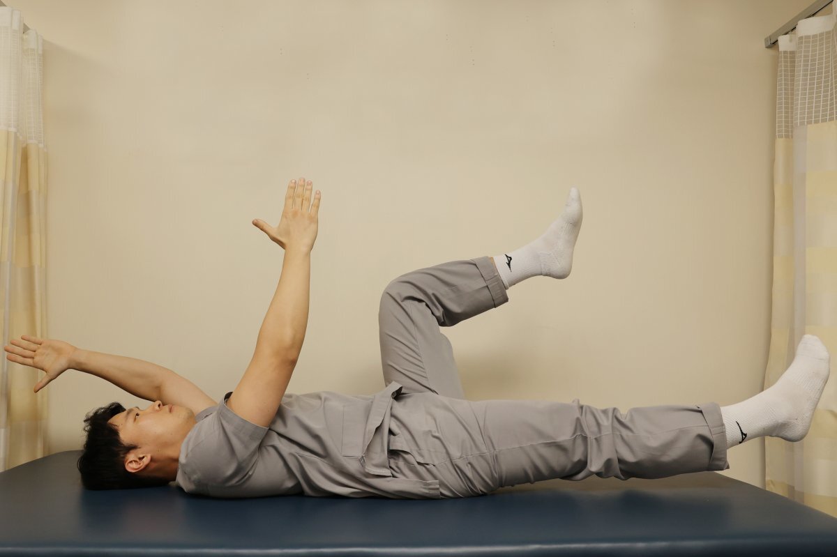 ④천장을 보고 눕는다. 팔과 다리를 모두 들어 올린다. 이때 무릎은 직각이 되도록 한다. 그 상태에서 팔과 다리를 번갈아 휘젓는다. 왼팔을 머리 쪽으로 뻗었다면 오른팔은 발 쪽으로 쭉 뻗는 식이다. 배에 힘을 주고 바닥을 누르는 느낌이어야 한다. 15회씩 2, 3세트 반복.