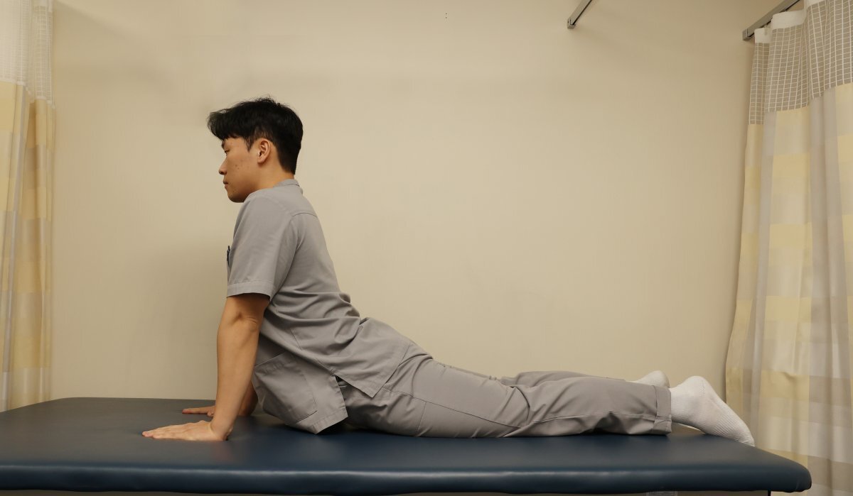 ③ 머리는 든 채로 바닥에 엎드린다. 이어 양손으로 바닥을 밀며 상체만 일으킨다. 이때 하체가 바닥에서떨어지면 안 된다. 천천히 상체를 일으키며 하체에 집중한다. 15회씩 2, 3세트를 반복한다.