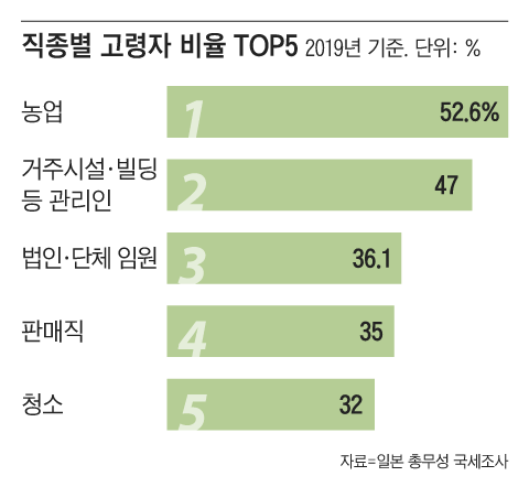 “정년퇴직을 전후로 보면 근무업종에 큰 변화가 생긴다. 우선 사무직이나 전문·기술직 비중이 크게 줄어든다. 사무직을 예로 들어보겠다. 25~29세가 사무직에 종사하는 비중은 전체 취업자의 19%에 달한다. 나이가 들수록 점점 높아져서 50대가 되면 23%를 찍는다. 하지만 이후 점점 줄어들어 70대에는 9%로 쪼그라든다. 전문·기술직 역시 흐름은 비슷하다. 나이가 들어 일할 자리가 없다고 불평한다면 대부분 ‘데스크워크(책상근무)’라고 말할 수 있겠다. 하지만 현장근무는 오히려 고령자들이 이끈다고 봐야 한다. 실제 통계를 보면, 농업은 65세 이상 고령자 비중이 53%에 달한다. 거주시설·빌딩 관리인(47%), 판매직(35%)도 해당 직종 내에서 고령자 비중이 높은 현장직이다.”