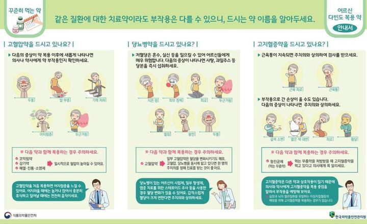 한편 의약품안전원은 다양한 의약품을 복용하는 어르신들의 안전한 의약품 사용 환경 조성을 위해 의약품의 올바른 사용방법과 부작용 예방에 도움이 되는 정보가 담긴 리플릿을 배포한 바 있다.