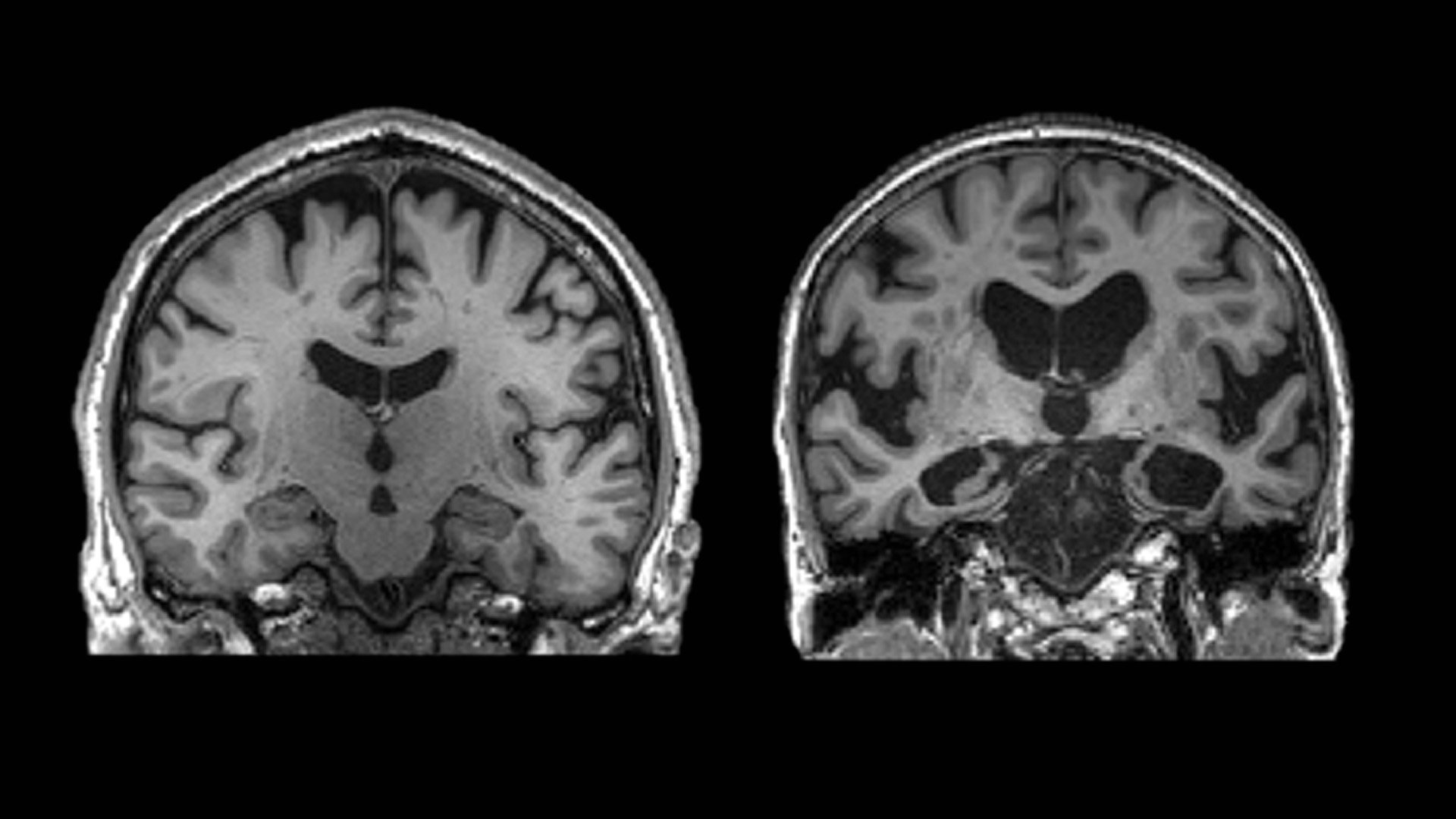 중년을 어떻게 보내느냐에 따라 당신의 뇌는 치매에 부쩍 다가설 수도 있고, 한없이 미룰 수도 있다. 치매 관리의 핵심 시기는 중년이다. 부피가 충분해 보이는 왼쪽 뇌는 정상인. 쪼그라들어 휑해 보이는 오른쪽 뇌는 알츠하이머 환자. 사진 Leonidas Chouliaras et al., 2023