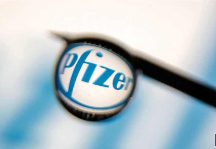 주사기 바늘 끝의 주사액 방울에 비친 화이자의 로고 모습./연합뉴스